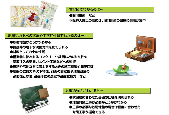 また、収集した過去の資料から、その地盤の歴史を推し量る事ができ、災害に逢いやすい場所等が判明します。