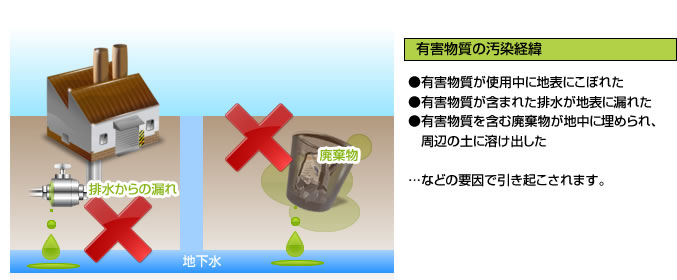 『土壌、地下水汚染』とは、人体に悪影響となる有害物質が土壌や地下水へ浸透し、人の健康を阻害しうる状態を言います。これらは、土地を所有していた事業者による有害物質の取り扱いが要因となっています。